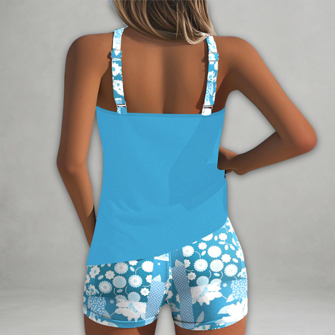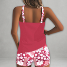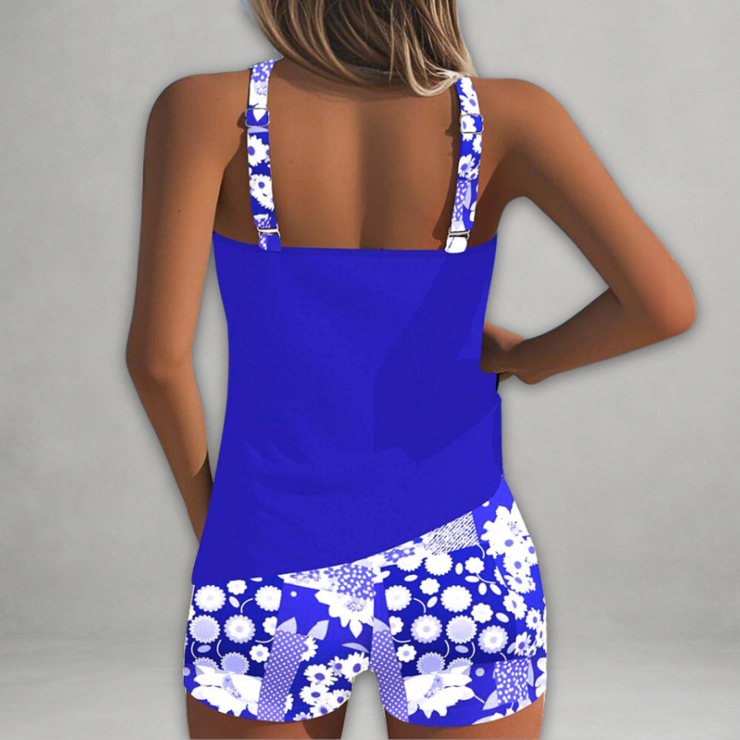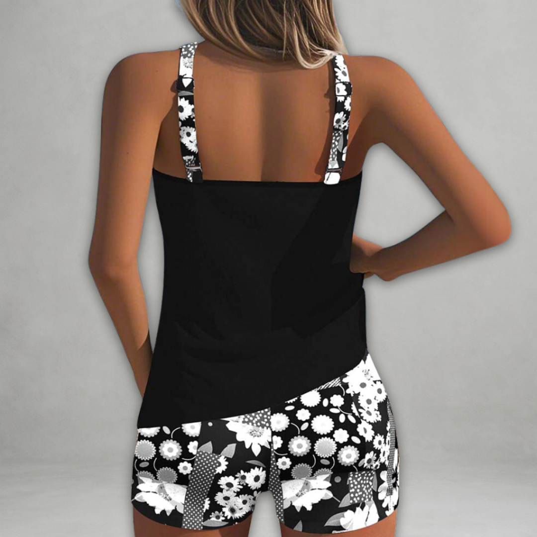Il top con spalline larghe e regolabili assicura una vestibilità comoda e sicura, mentre gli shorts floreali offrono massima libertà di movimento.